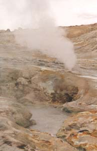 Je ďalší deň a všetko je tu 2x ďalej a všetko tu trvá 2x dlhšie ako tvrdia domorodci. Už sme spomínali príhodu prvého dňa s kempom v Reykjavíku. Dnes (13.6.1998) bolo na jednej smerovke 3 km a trvalo nám to, akoby to bolo 5 km. Hneď potom bolo tabuľka 300 m a prešli sme asi 500 m. Ako vraví Ďuro: "Všade chodia autom, zmrdi." Pri bahenných sopkách a sulfarelách sme stretli ľudí z informačného centra. Zahladzovali stopy po turistoch, ktorí prešli za vyhradenú zónu, aby ich nenasledovali iní. Vyzerá to tak, že dosť často sa nejaký turista stane neúmyselným tvorcom nového krátera (napr. francúzsky kráter). Bahenné sopky sa každý rok posúvujú, takže musia meniť značenie.