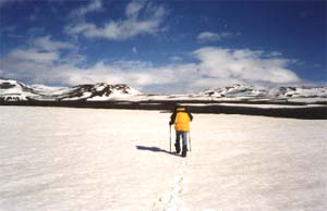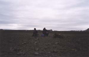 Keďže sme boli včera v púšti, tak sme boli veľmi opatrní s vodou. Pred vstupom do púšte sme mali spolu 7,5 litra vody. V najhoršom prípade by sme vydržali dva dni. Keďže sme nevedeli, čo nás čaká, tak sme dokonca rátali hlty vody. Zvyčajne sme si dali 2 hlty na prestávku, čo bolo 1liter/10km (všetci spolu). Keď sme zbadali snehové polia, už to bolo OK. Všetok sneh na okolí leží na tmavej a priepustnej láve a tak voda, ktorá sa topí steká priamo do lávy. Našťastie sme však našli kúsok od chaty niekoľkometrový pramienok vody. Vytekal spod snehu a o niekoľko metrov ďalej mizol v láve. Trávime teda čas, ktorý by sme venovali topeniu snehu, ďalekým pohľadom na vzdialené kopce, dumkám o cestovaní na Islande a písaniu.