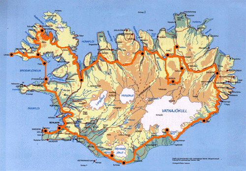 Takto vyzerá Island na mape a oranžová čiara je naša cesta: